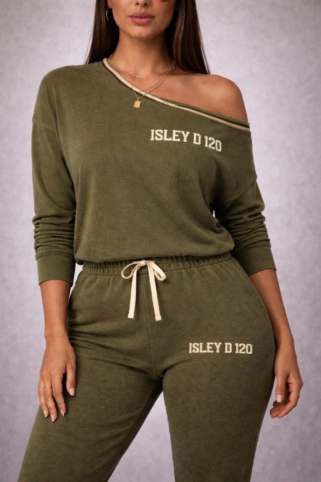 A signature ISLEY D 120 silhouette designed to merge modern athletic aesthetics with elevated feminine tailoring. The Earth League Dress features an off-shoulder neckline, sculpted fit, athletic stripe sleeve detailing, and bold front ISLEY D 120 branding with oversized 120 numbering.